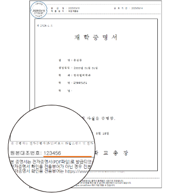 - 발급된 문서하단에 2차원 바코드가 출력된 증명서인 경우 바코드 검증 프로그램으로원본대조 할수 있습니다